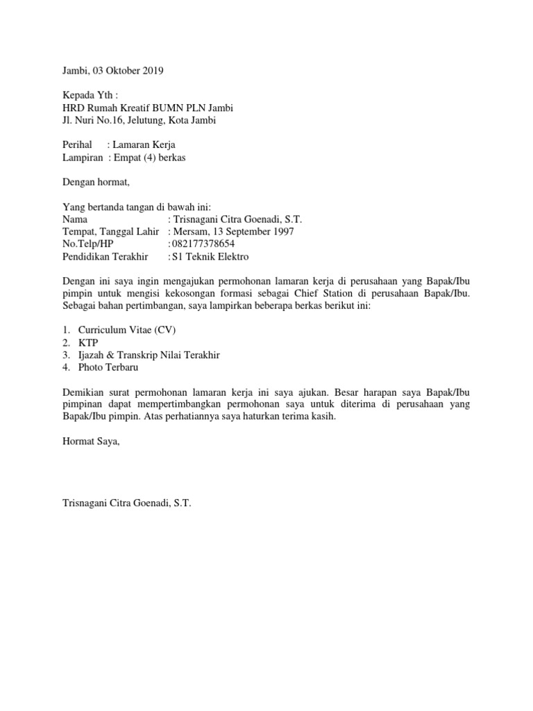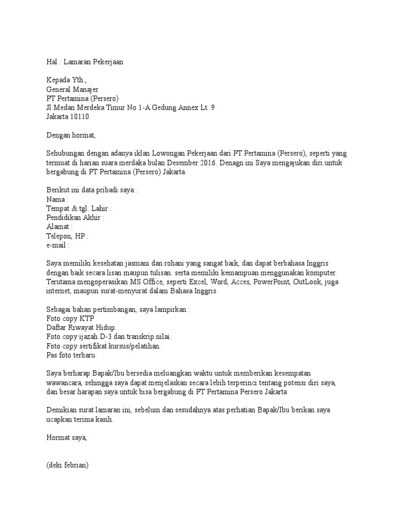 Contoh surat lamaran kerja di bumn adalah contoh lamaran pekerjaan terbaru yang akan admin bagikan pada kesempatan ini untuk anda yang ingin melamar kerja di perusahaan bumn. Banyak orang yang menyepelekan akan pentingnya. Berikut contoh surat lamaran pekerjaan terbaru 2019 resmi yang baik dan benar dengan format formal yang bisa anda unduh untuk melamar di perusahaan bumn. Mau apply surat lamaran kerja dimana guys? Daftar isi hide 18 contoh surat lamaran kerja terbaru dan lengkap dengan berbagai jenisnya 15.