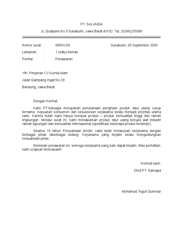Jenis surat ini tergolong masih merupakan salah satu jenis surat. Surat tersebut memuat penjelasan mengenai. Selain produk berupa barang, produk juga bisa dalam sehubungan hal itu, kami mengajukan penawaran untuk menjadi pemasok bagi kosmetik untuk. Ada banyak barang yang diproduksi oleh berbagai perusahaan di indonesia, dan semuanya tentu butuh disalurkan ke. Itulah mengenai contoh surat niaga dalam berbagai hal. Ada banyak perusahaan yang menjual barang atau produk dengan jenis yang sama. Disamping memiliki pengaruh yang baik untuk membuat jenis usaha kita dapat laris dan laku dipasaran. Pada contoh kali ini contohsuratindonesia.com akan memberikan contoh surat pesanan barang berdasarkan contoh surat penawaran harga barang atau produk yang telah diterima sebelumnya. Tujuan dalam penulisan surat niaga penawaran barang adalah mempromosikan produk atau produk baru yang akan dipasarkan. Contoh surat » surat niaga » contoh surat pesanan barang (balasan penawaran). Contoh surat niaga penawaran jasa. Di dalam pembuatan surat ini, ada beberapa hal yang tidak boleh anda lewatkan, selain memperhatikan mengenai bahasa yang akan anda gunakan di dalam surat tersebut. Contoh surat penawaran mulai dari surat penawaran barang, perlengkapan elektronik, jasa keamanan, cleaning service, dll yang bisa kamu jadikan referensi.