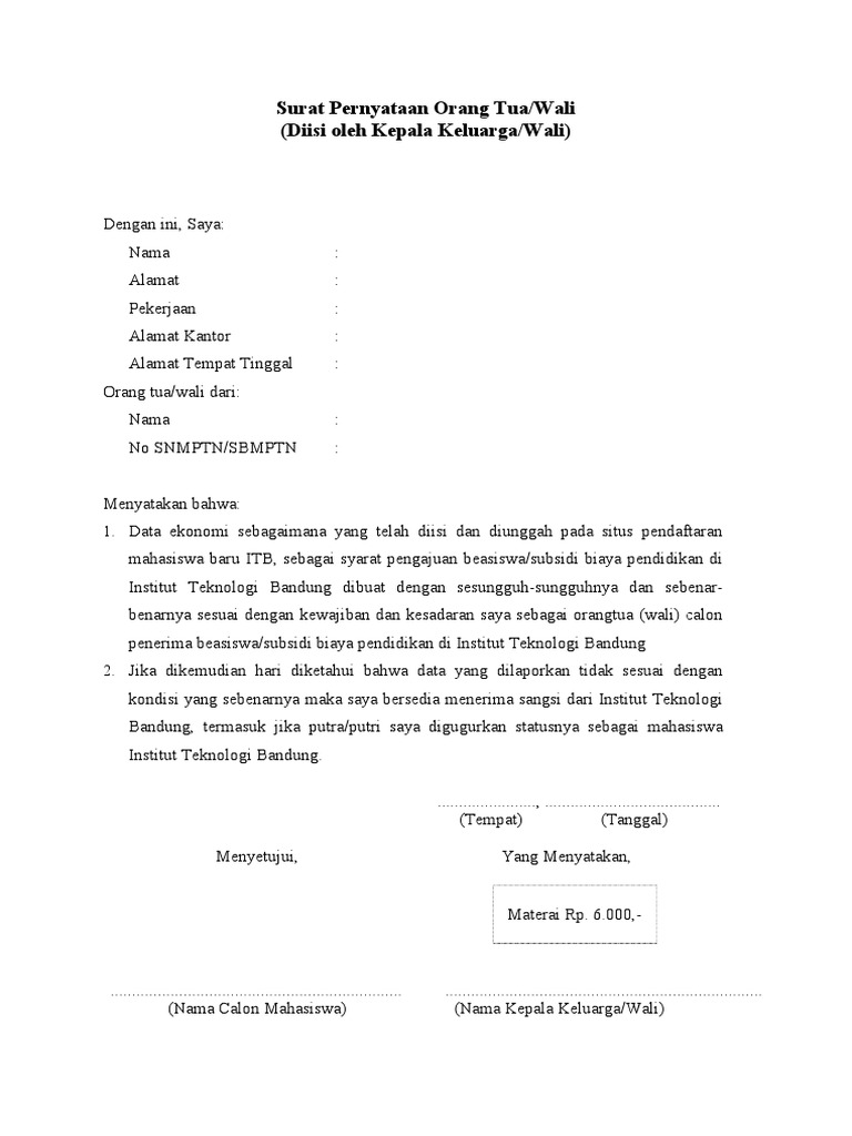Surat pernyataan orang tua bisa digunakan untuk berbagai macam kepentingan. Melalui surat pernyataan penghasilan orang tua ini, saya selaku orang tua dari cantika dwi ardinaputri menyatakan bahwa memiliki penghasilan sekitar. Administrasi yang baik tetap harus membuat surat pernyataan bahwa orang tua / wali murid memberikan izin untuk mengikuti pembelajaran tatap muka. Surat pernyataan adalah surat yang dibuat oleh seseorang yang berisi pernyataan dirinya atau menerangkan orang lain bahwa orang tersebut pernah atau tidak pernah melakukan sesuatu. Walaupun sudah tersedia berbagai komunikasi canggih dan demikian surat pernyataan ini kami buat dengan sesungguhnya untuk dijadikan sebagaimana mestinya.